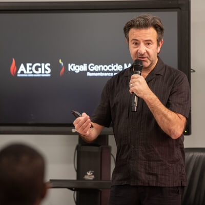 Shay Pilnik introduced Emil Fish, and explained how their visit to Rwanda for Holocaust Memorial Day had come about. A meeting with the Aegis Trust’s Executive Director Freddy Mutanguha, a survivor of the Genocide against the Tutsi, “changed the way I look at Holocaust education and changed my life,” he said. “What I learned from Freddy is that the story of the Holocaust can be incredibly meaningful in a different context. Every story is unique … but when you want to learn how genocide evolves and what process brings genocide from A to Z, the patterns are the same…. When I told Emil about Freddy and told him that for International Holocaust Remembrance Day we had an invitation from Kigali, Emil’s immediate response was, “we’re going there.”